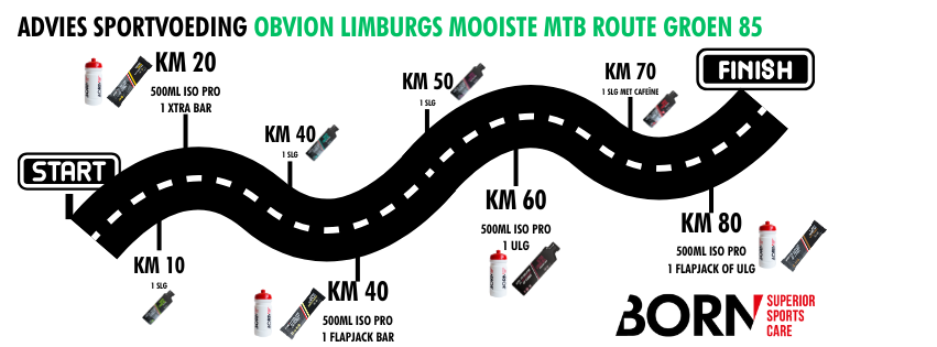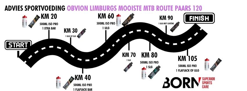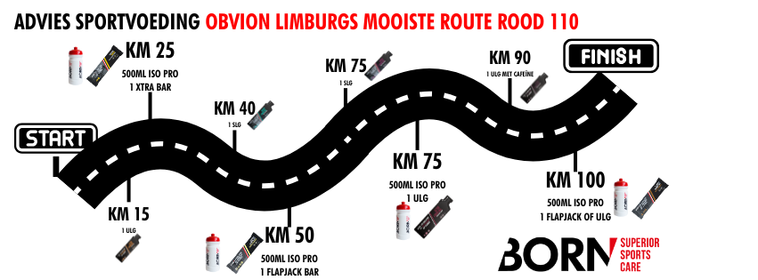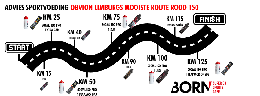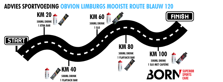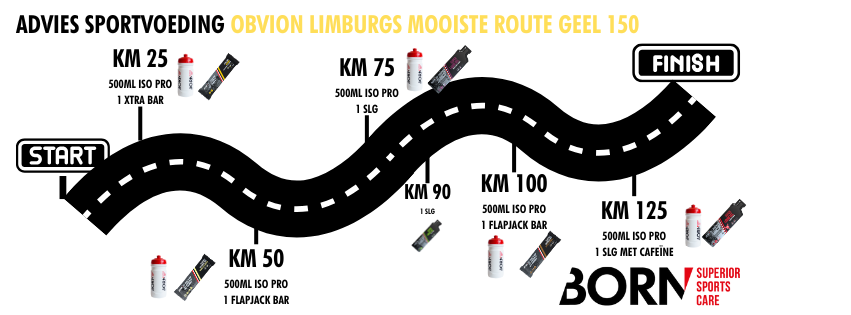 In het heuvelachtige Zuid-Limburg verbrand je lichaam flink wat energie. Met de juiste sportvoeding houd je je energieniveau op pijl, voorkom je kramp en zorg je ervoor dat je de finish haalt. Maar: meer is niet altijd beter. Je wil precies genoeg binnenkrijgen om te presteren, zonder je lichaam onnodig te belasten. Daarom heeft BORN voor elke route een slim voedingsadvies ontwikkeld, afgestemd op afstand en intensiteit.